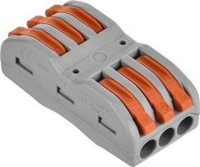Клемма строительно-монтажная проходная серии 222 предназначена для соединения одножильных и многожильных медных проводников без использования инструмента в электрических сетях переменного и постоянного тока. Клемма допускает многократное присоединение и отсоединение проводников. Количество подключаемых проводников - 3/3.