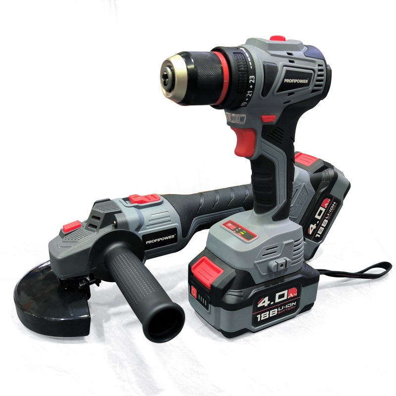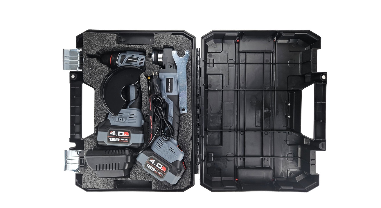 Набор инструментов ProfiPower E0220 включает в себя 2 аккумуляторных инструмента: углошлифовальную машину ProfiPower MKDGA-18V и шуруповерт MKBL-18V, что помогает выполнять различные задачи во время ремонта.