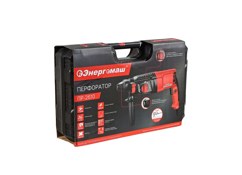 Перфоратор Энергомаш ПР2610 — компактный, маневренный электроинструмент для сверления отверстий в таких материалах как: дерево, сталь, кирпич, бетон или снятия старой керамики, штукатурки. В целях выполнения конкретной задачи следует выбрать один из трех режимов: «сверление», «сверление с ударом», «удар». Данная модель отлична подвижным и надежным переключателем реверса и широкой пусковой кнопкой сподручной для верного регулирования скорости вращения патрона.