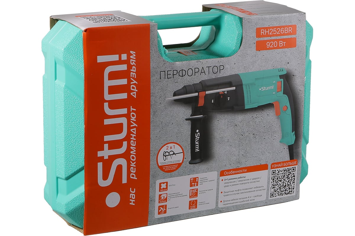 Sturm RH2526BR – универсальный трехрежимный перфоратор c патроном под оснастку SDS Plus. Имеет классическую горизонтальную компоновку с продолговатым узким корпусом и небольшую массу, за счет чего максимально удобен при высотных работах, а также при эксплуатации в условиях с ограниченным доступом. Корпус инструмента выполнен из высококачественного пластика с применением нейлона и демонстрирует хорошую стойкость к ударам и воздействию низких температур Модель оснащена электродвигателем мощностью 920 Вт и усиленным вакуумно-компрессионным механизмом, развивающим энергию удара – 3.0 Дж – это дает возможность уверенно бурить отверстия диаметром до 26 мм в материалах различной твердости, включая кирпичную кладку, камень и бетон. Наличие функции реверса с подпружиненным механизмом поворота щеточного узла позволяет сохранять одинаковую мощность при любом направлении вращения и исключить случайные переключения во время использования Перфоратор Sturm RH2526BR является трехрежимным – в зависимости от конкретной задачи пользователь выбирает нужный: сверление, сверление с ударом, либо режим удара. Также, предусмотрен отдельный режим, дающий возможность установки долота в любом угловом положении. Для безопасности пользователя в перфораторе установлена предохранительная кулачковая муфта SafetyClutch, гарантирующая защиту от обратного удара в случае заклинивания оснастки. Сетевой кабель 4VelcroRubber имеет резиновую изоляцию, что сохраняет его гибкость и эластичность в условиях низких температур, а четырехметровая длина кабеля дает возможность использовать инструмент без применения дополнительного сетевого удлинителя, обеспечивая рабочую зону площадью до 50 м2. Инструмент штатно комплектуется вместительным пластиковым кейсом для удобства хранения и транспортировки.