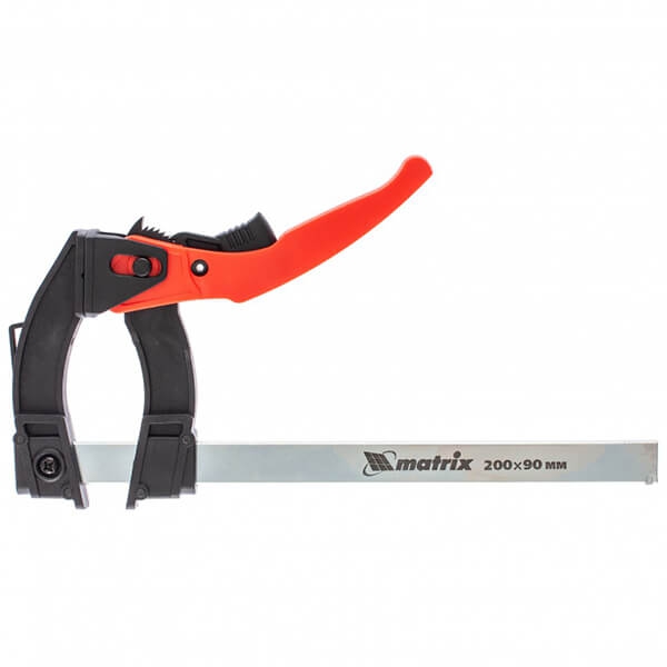 Реечная быстрозажимная струбцина MATRIX 200х90х290 мм, штанга 5х20мм выполнена из легкого и прочного материала.