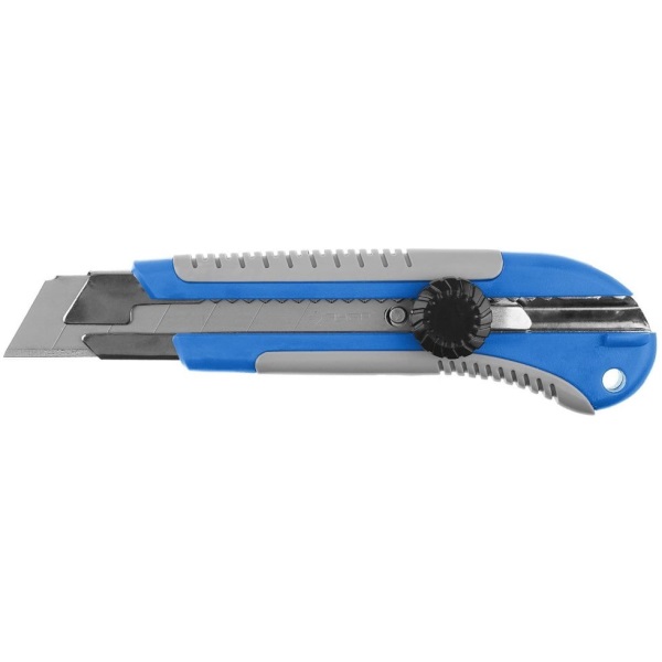Нож с выдвижными лезвиями 25мм ЗУБР применяется для разрезания жестких материалов, например, резины или фанеры.