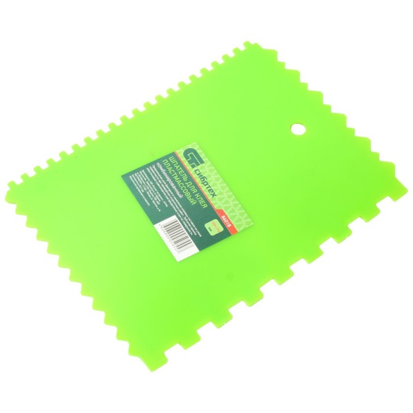 Инструмент изготовлен из пластика, а зубчатая кромка обеспечивает равномерное нанесение строительной смеси на поверхность. Размер - 130х170 мм.