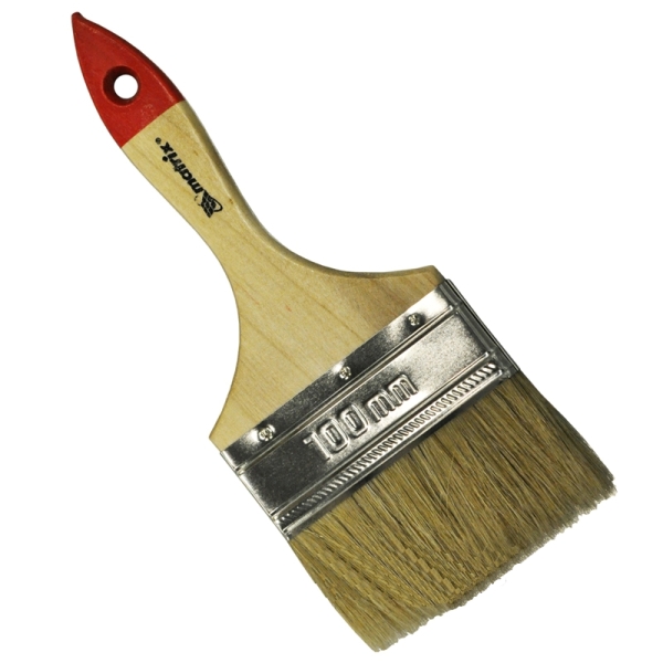 Плоская кисть применяется для малярных работ с олифой, древесным маслом и другими ЛКМ. Ширина рабочей части кисти составляет 100 мм. Краска равномерно распределяется по обрабатываемой поверхности благодаря расщепленным кончикам натуральной щетины. Малый вес кисти способствует более продолжительной работе и меньшей утомляемости.