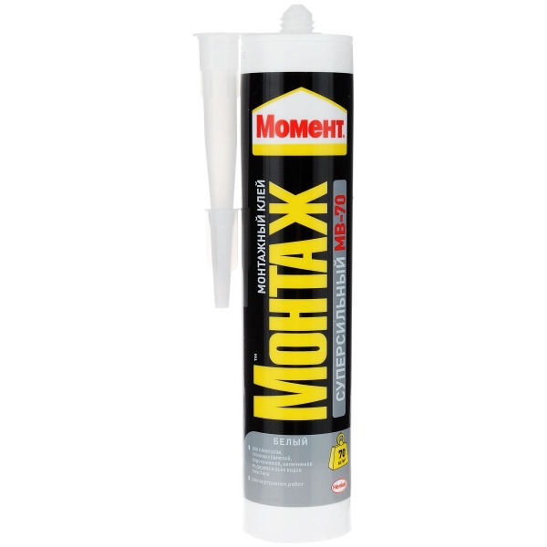 Клей МОНТАЖ суперсильный Момент 697133 используется, когда необходимо прочное склеивание. Подходит как для внутренних, так и наружных работ, заполняет трещины до 1 см. Данный клей не содержит растворителей и не имеет запаха. Хранить его необходимо при температуре не ниже 0 ºС. Соединяемые поверхности должны быть обезжиренными, и одна из них должна впитывать клей. Склеивание осуществляется при температуре от 10 ºС, в течение 15 минут. Не подходит для склеивания полиэтилена, полипропиле на, тефлона и аналогичных материалов.