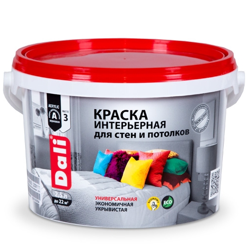 DALI Краска интерьерная Акриловая для стен и потолков Назначение: Декоративное окрашивание стен и потолков в сухих жилых и общественных помещениях с нормальной эксплуатационный нагрузкой. Преимущества: универсальность:подходит для окрашивания стен, потолков и обоев в любых типах помещений оптимальное соотношение «цена-качество» с сохранением высоких показателей износостойкости, укрывистости и белизны устойчивость к сухой или лекгой влажной уборке Область применения Применяется внутри помещений п о минеральным поверхностям (бетон, кирпич, гипс, цемент, гипсокартон, шпатлевка, штукатурка и др.)