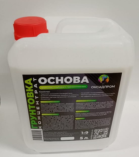 Грунтовка «Оксидпром- Основа» концентрат предназначена для обработки впитывающих, сильно впитывающих - всех типов минеральных поверхностей, цементных, известковых и гипсовых штукатурок, стяжек, бетона, всех видов кирпича, природного камня, древесностружечных и древесноволокнистых плит, гипсокартона и т.п.