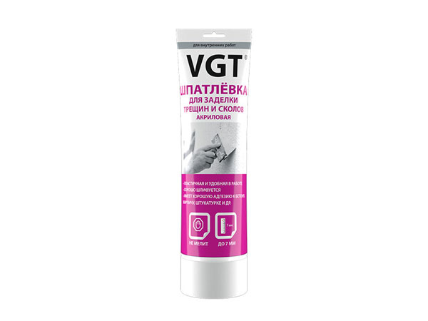 VGT ремонтная шпатлевка на основе стирол-акрилового сополимера используется для заделки трещин и сколов поверхности внутри сухих помещений. Материал основания - бетон, ГКЛ, кирпич, штукатурка, дерево.