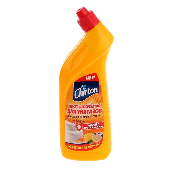 Гель для чистки туалета Chirton "Лимон" 750г подходит для чистки фарфоровых и фаянсовых унитазов, раковин и кафельной плитки, удаляет ржавчину, известковый налёт и другие загрязнения.
