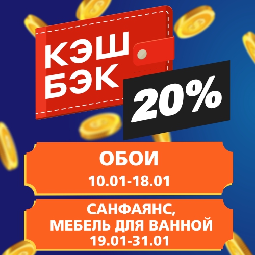 Кэшбек 20% на обои, санфаянс и мебель для ванной комнаты
