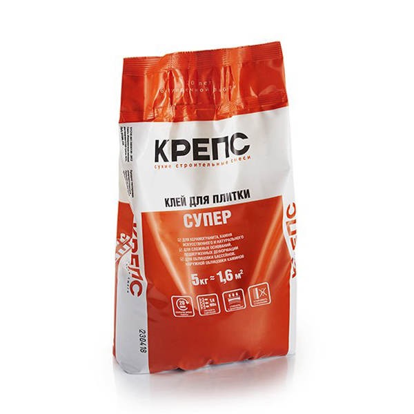 Клей для плитки Крепс "Супер", 5 кг - сухая строительная смесь, состоящая из цемента, мелкозернистого фракционированного песка, модифицированная специальными добавками, в том числе полимерными. После затворения водой образует пластичную растворную смесь с высокой устойчивостью к сползанию.
