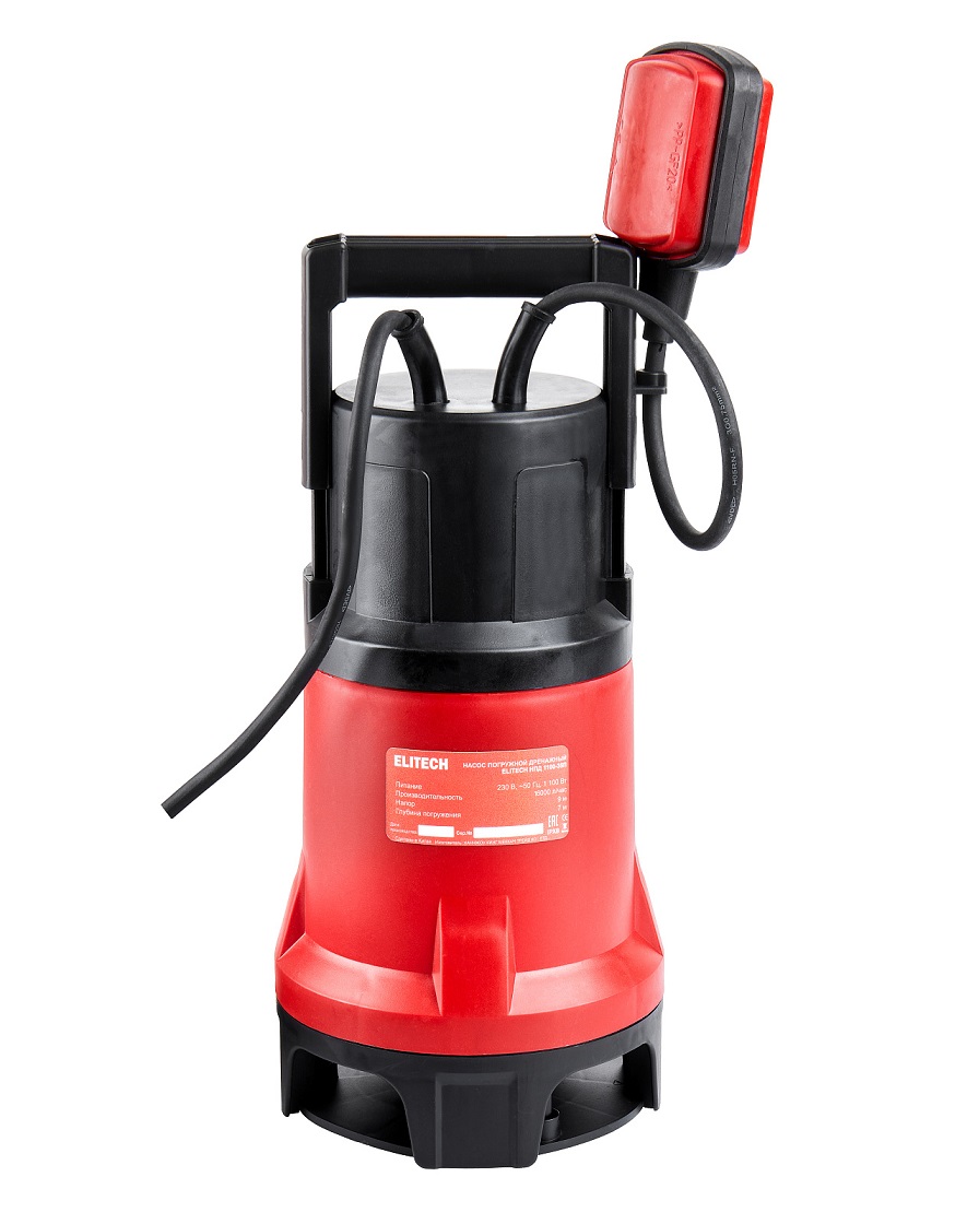 Погружной дренажный насос «ELITECH» мощностью 1100 Вт и производительностью 16 000 л/час предназначен для перекачивания загрязненной воды с диаметром твердых частиц не более 35 мм из колодцев, открытых водоемов, затапливаемых подвалов и других источников.
