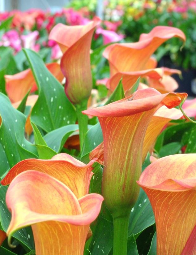 Эта калла прекрасно чувствует себя в горшках и украсит любой балкон или террасу. На одном цветоносе образуется несколько роскошных цветков, достигающих высоты 45-50 см.