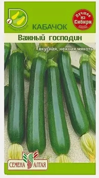 Кабачок «Важный Господин» от производителя «Семена Алтая» — раннеспелый высокоурожайный сорт. От полных всходов до технической спелости плодов проходит 42–53 дня. Растение полуплетистое, подходит для выращивания в открытом и закрытом грунте