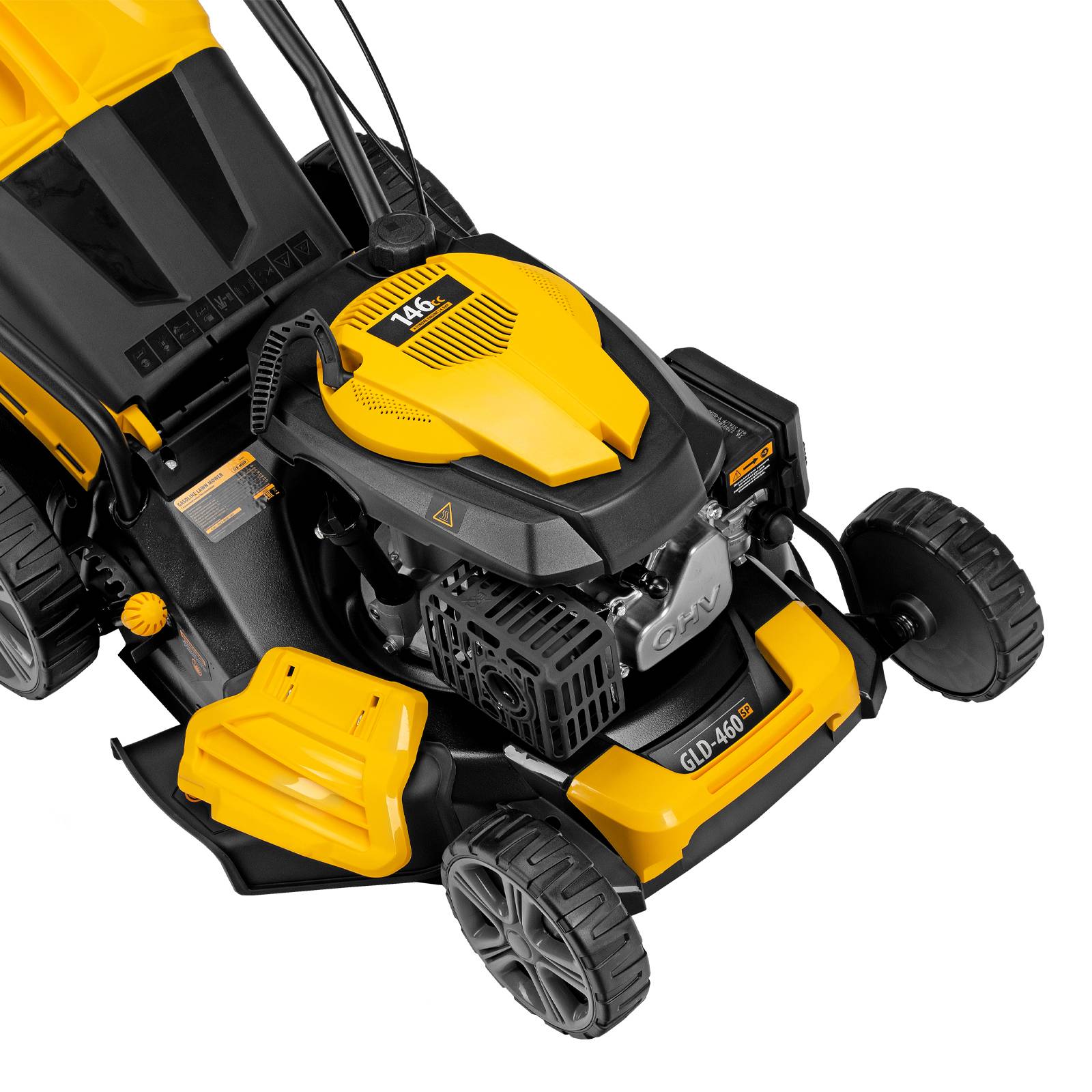 Газонокосилка бензиновая Denzel GLD-460SP 58803 с двигателем объемом 146 куб.см, с приводом, отличается шириной прохода 46 см, имеет 7 уровней скашивания и оборудована травосборником на 50 л. Предназначена для срезания и мульчирования травы на приусадебном участке. Усиленная дека, увеличенный диаметр колес и прочный нож обеспечивают эффективное окашивание сложной территории с зарослями и стеблями. При систематическом применении газонокосилка предотвращает распространение сорняков на участке.