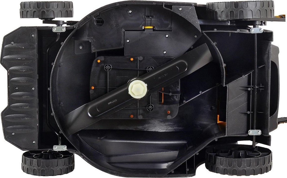 Высота кошения легко регулируется центральным рычагом. Колеса косилки не портят газон во время работы и обеспечивают уверенное перемещение по участку.