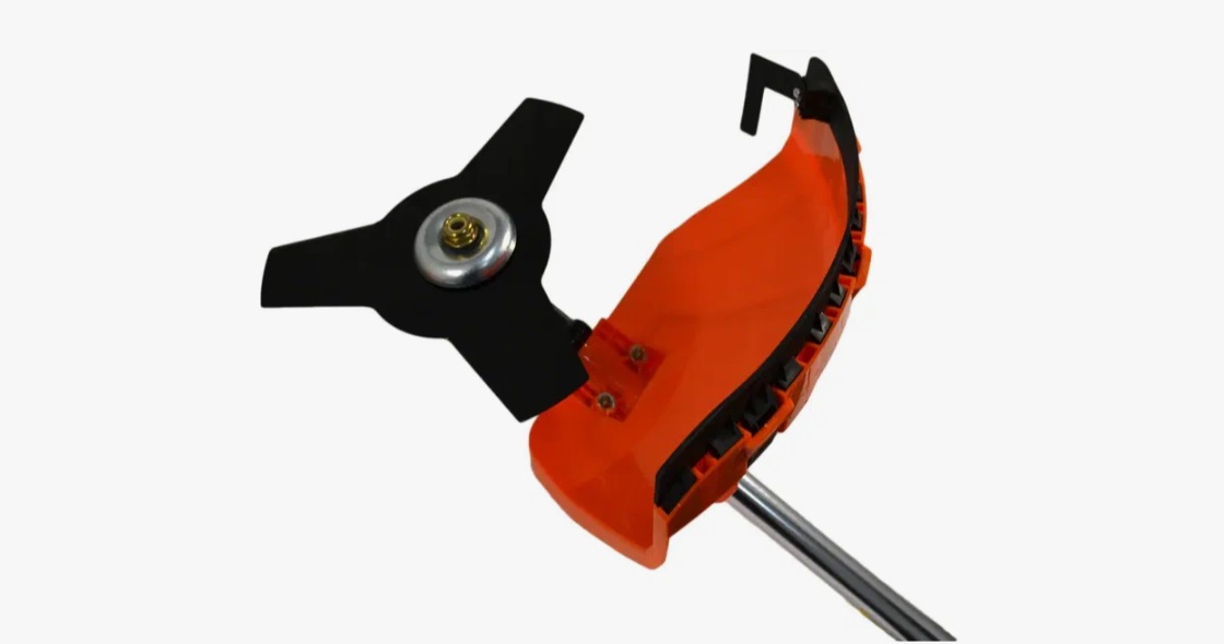 Режущие элементы включают леску и нож, что позволяет эффективно справляться с различными типами растительности.
