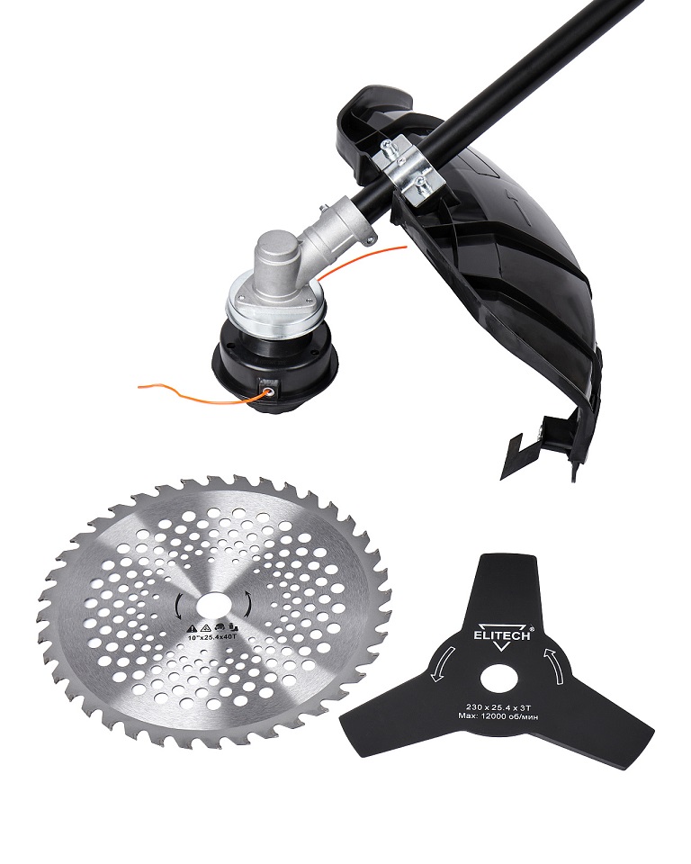 Электрический триммер с прямой разборной штангой и петлевой ручкой мощностью 1200 Вт, с шириной захвата кордом (леской) 400 мм, ножом 230 мм и диском 255 мм,