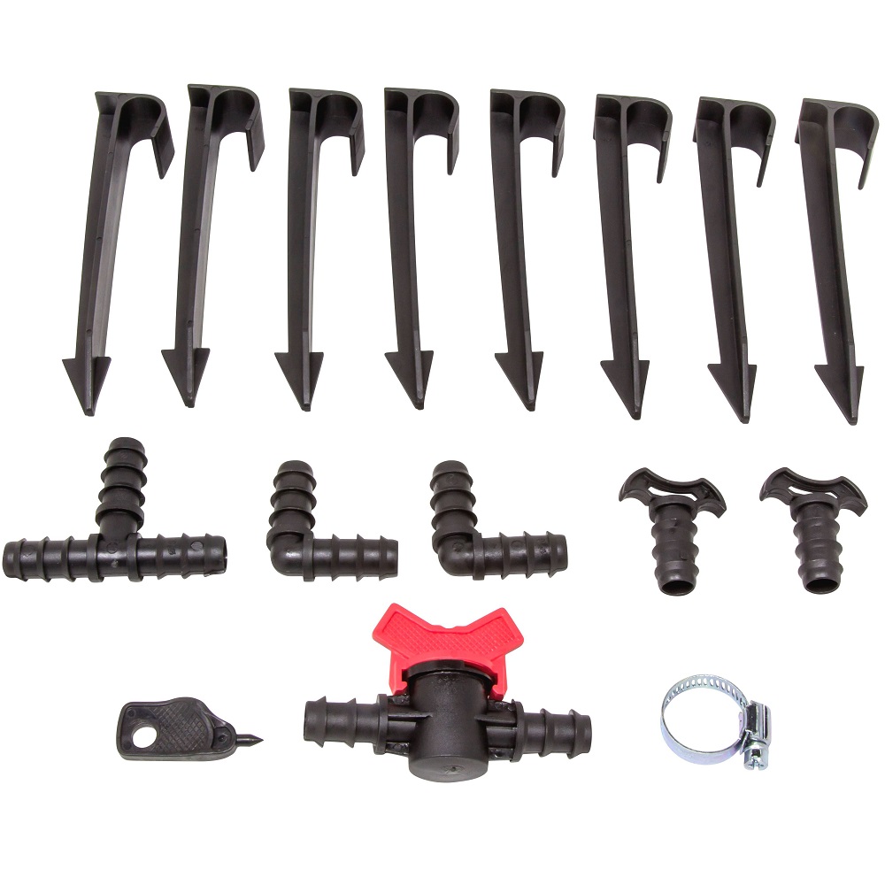 В набор входят специальные колышки для фиксации капельной трубки в грунте (для большей надежности).