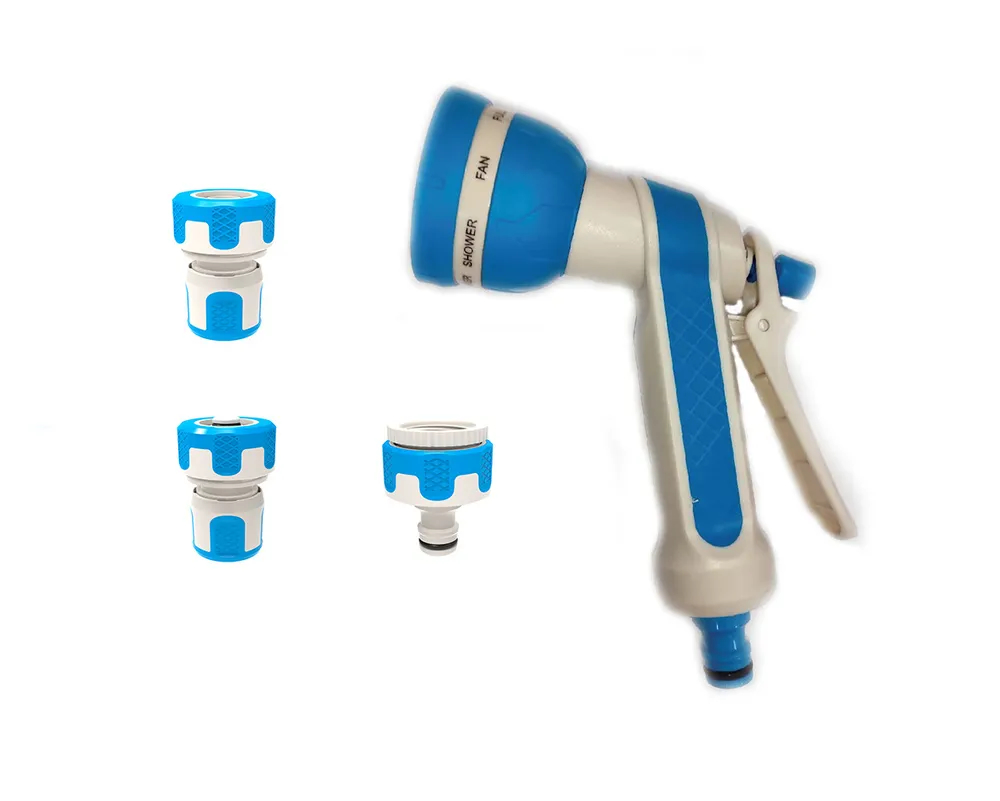 Пистолет-распылитель и коннекторы выполнены из ударопрочного ABS пластика. Рукоятка пистолета и ободок сопла покрыты слоем термопластичной резины (TPR), для предотвращения контакта с холодной поверхностью и защиты от выскальзыван ьзывания. Пистолет-распылитель оснащен удобным металлическим фиксатором для длительного непрерывного полива. Коннектор позволяет быстро и без дополнительных инструментов подсоединять пистолет-распылитель к шлангу.