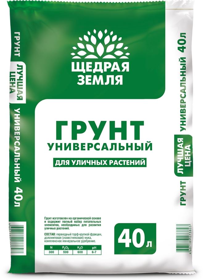 Грунт универсальный Щедрая земля - готовый к применению универсальный питательный грунт с минеральными удобрениями. Применяется для посадки и пересадки всех садовых растений.