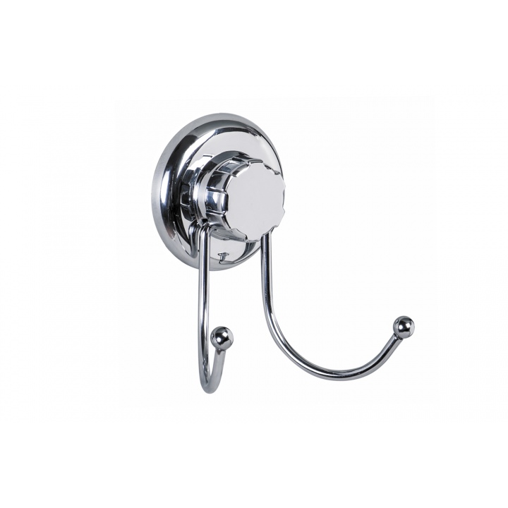 Двойной крючок из хромированной стали, крепящийся к стене при помощи вакуумной присоски.