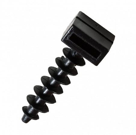Специальный дюбель, который применяется для крепления кабельных хомутов-стяжек к основаниям из следующих материалов: бетон, ячеистый бетон, газобетон, полнотелый и пустотелый кирпич, плиты, блоки, камень. Изготовлен из высококачественного нейлона. Рабочая часть дюбеля выполнена в виде пластин, которые при забивании сминаются определенным образом и обеспечивают надежную фиксацию дюбеля в материале основания. В головке дюбеля имеется прямоугольное отверстие, через которое продевается хомут. Дюбель устанавливается в предварительно просверленное отверстие.