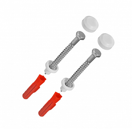 В состав набора для крепления унитаза входят: шурупы сантехнические DIN 571 6,0х70 мм (2 шт.), дюбели распорные трехсегментные 10,0х50 мм (2 шт.) и втулки с колпачками (2 шт.).