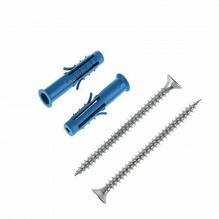 В состав комплекта крепежа входят: дюбели четырехраспорные «Чапай» 5,0х40 мм (2 шт.) и универсальные саморезы с потайной головкой 3,5х50 мм (2 шт.). Дюбель четырехраспорный «Чапай» универсален, применяется для крепления изделий к основаниям из всех типов строительных материалов: полнотелый кирпич, пустотелый керамический кирпич, полнотелый бетон, керамзитобетон, листовые материалы. При монтаже в пустотелых материалах шуруп вязнет в свободном конце дюбеля и скручивает его в узел. Устанавливается в предварительно просверленное отверстие.