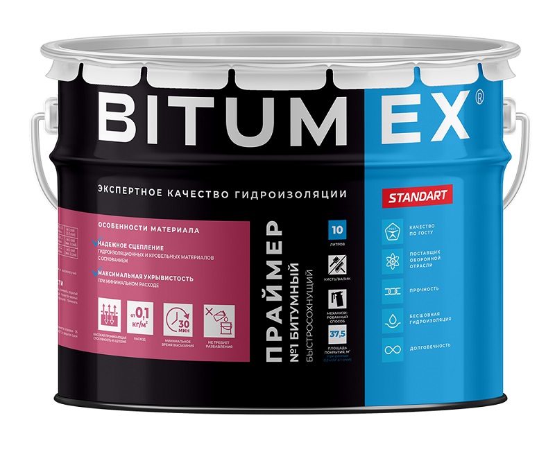 BITUMEX праймер битумный №1 быстросохнущий является готовым к применению материалом на основе высококачественного строительного битума и высоколетучего органического растворителя.