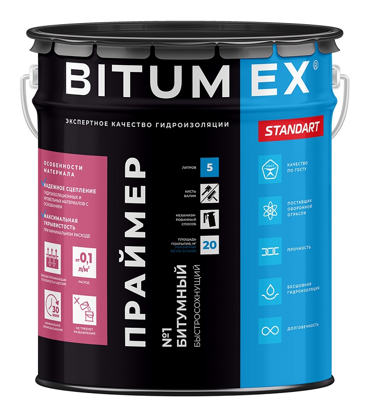 BITUMEX праймер битумный №1 быстросохнущий является готовым к применению материалом на основе высококачественного строительного битума и высоколетучего органического растворителя.