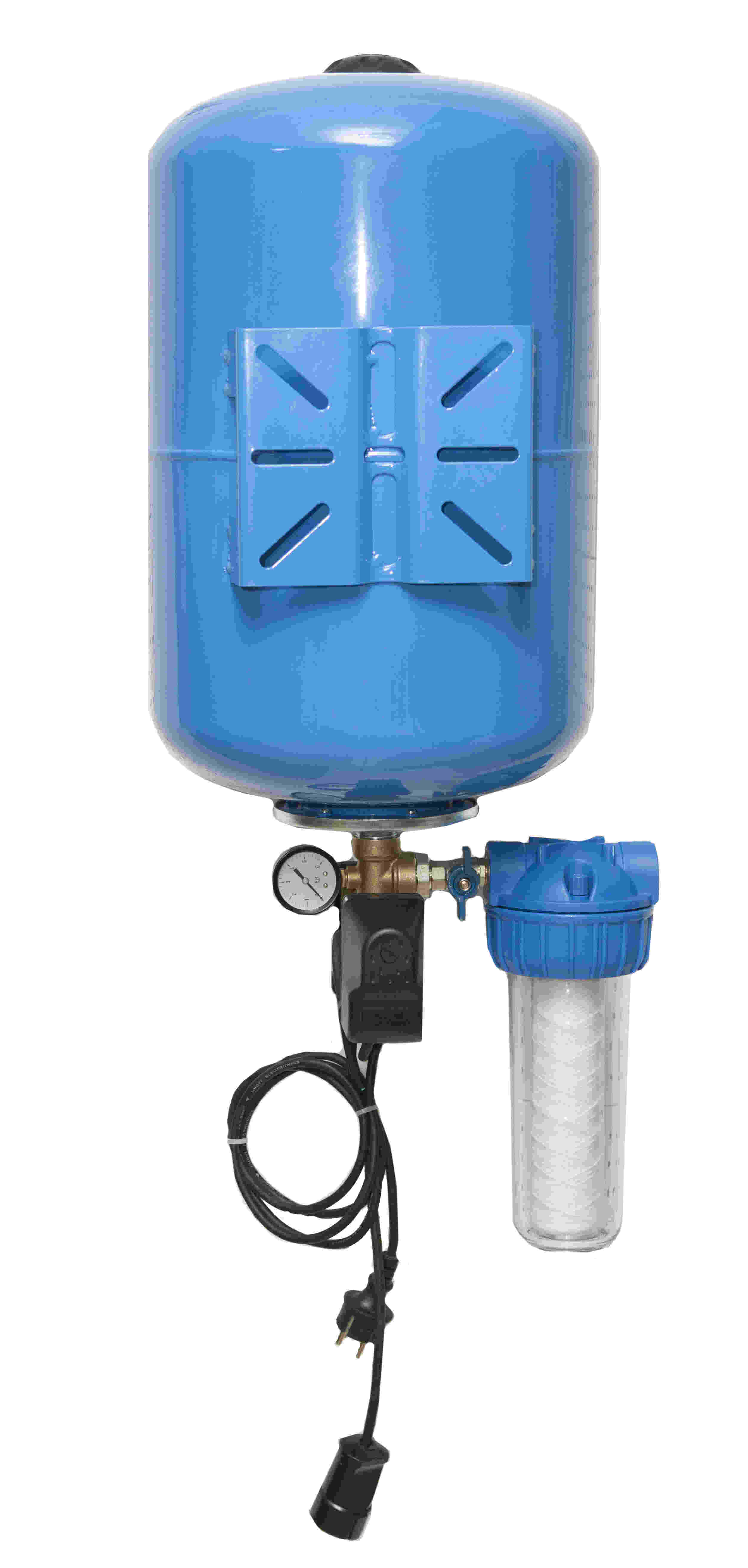 АвтоБак Eterna АВ2С-24 - готовое решения для создания автоматической системы водоснабжения. Исполнение для вертикального монтажа на базе латунного штуцера. Комплектуется: гидроаккумулятор 24 л, реле давления с манометром, реле сухого хода, колбой фильтра с картриджем, краном и обратным клапаном, электрическим кабелем.